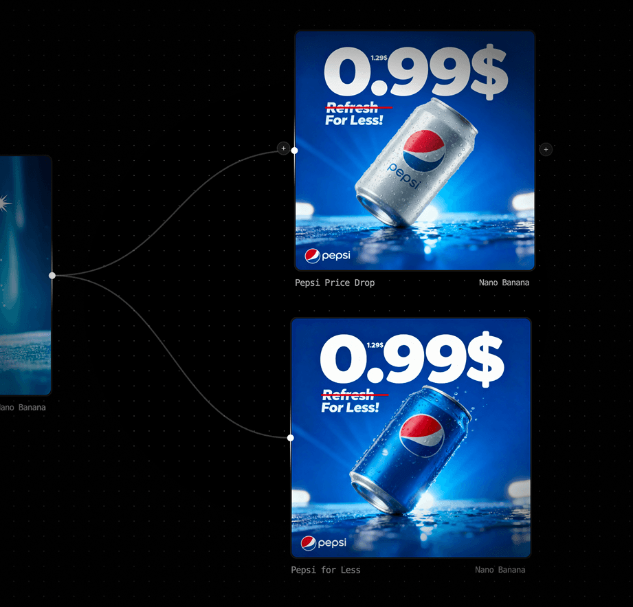 Combine 60+ AI models on one canvas to create visuals, videos, 3D assets, and SFX, and music.